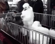 A white poodle stands on its hind legs and 'dances' with excitement in a pen with other dogs.