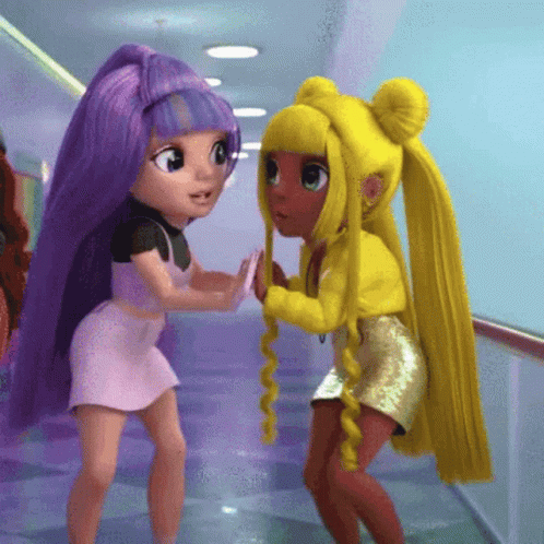 Sunny Madison and Violet Willow from Rainbow High are excited, holding hands and interacting.