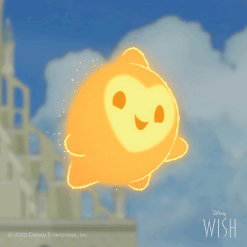 An excited, glowing orange Star character from Disney's Wish, sparkling against a castle backdrop.