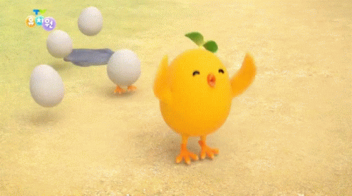 Ppia, the yellow chick from TV Kindergarten, happily jumps and waves its wings, surrounded by eggs.