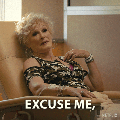 Glenn Close as Alberta, sitting in a hospital chair, asks 'Excuse me, can I help you?' from a Netflix show.