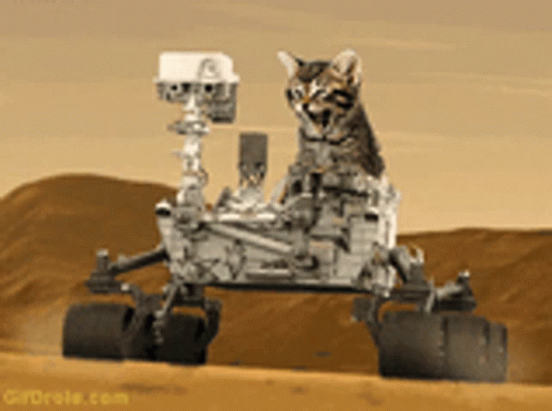 An 'Executivo Cat' rides on a robotic vehicle across a sandy, desert-like landscape.