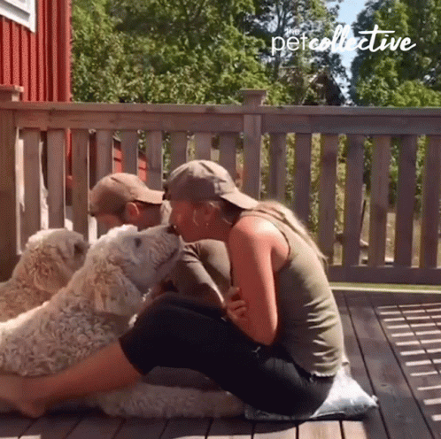 A couple does sit-ups on a deck with their two fluffy dogs providing adorable support and kisses.