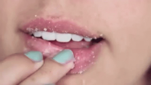 A person applies a lip scrub to their dry lips with a finger, demonstrating the exfoliation process.