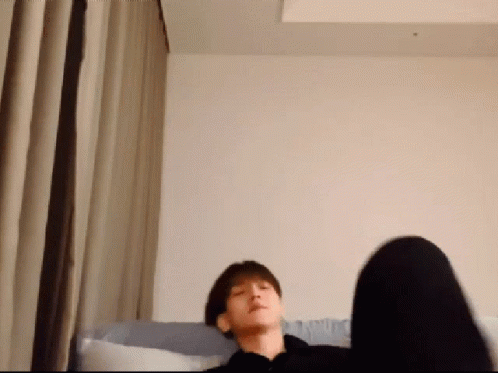 Exo's Baekhyun relaxing on a couch with his legs crossed, looking up in a chill moment.
