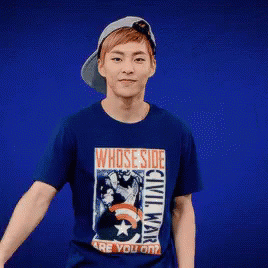 EXO's Xiumin winks, gives a peace sign, and salutes while wearing a 'Whose Side Civil War' t-shirt.