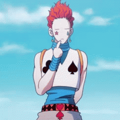 Hisoka from Hunter x Hunter pondering, finger to chin, with his signature playing card attire.