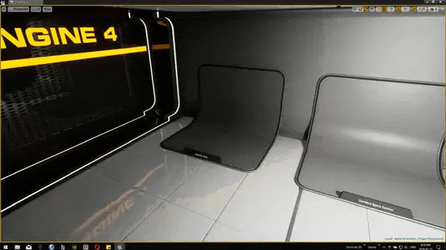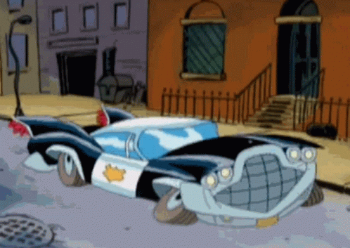 A cartoon police car, a Desoto, explodes on a city street, leaving a crater in the asphalt.