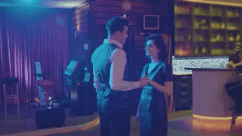 Eyfet (Meriç Aral and Burak Sevinç) share a romantic dance and hug in a dimly lit room.