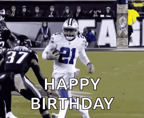 Ezekiel Elliott of the Dallas Cowboys hurdles a Philadelphia Eagles player during an NFL game, with 'Happy Birthday' text.