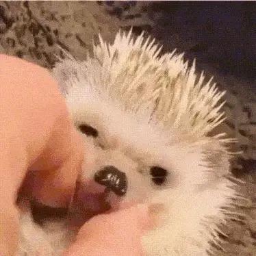 A cute hedgehog's face in a close-up, looking at the camera and moving its mouth.