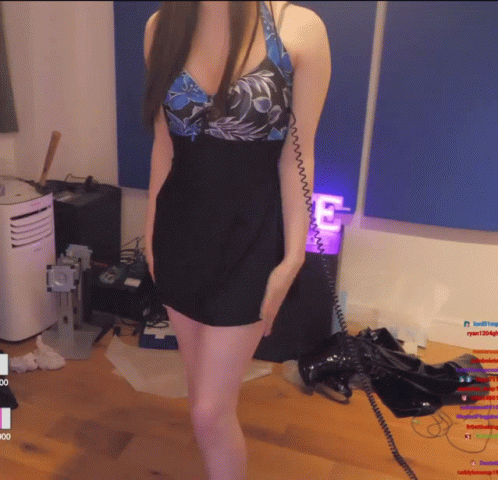 F1nn5ter, known for his fem persona, flexes his muscles while wearing a black dress with a blue floral top.