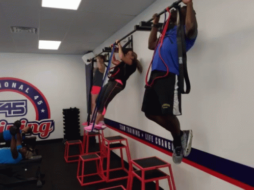 Group of F45 gym members performing assisted pull-ups with resistance bands during a team training session.