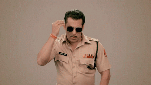 Salman Khan as Chulbul Pandey in his iconic police uniform, making powerful hand gestures.