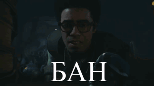 A man in glasses and a scarf stands in a dark room with the word 'BAN' displayed, likely from the game Fable.