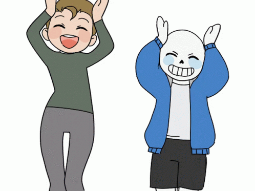 Grace and Sans from Undertale joyfully dance with their hands raised, both smiling and happy.