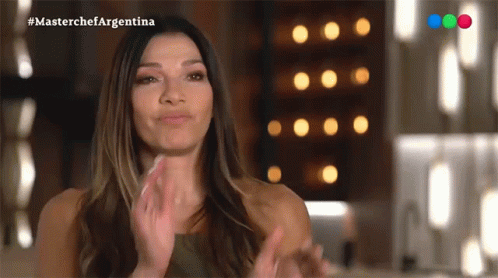 Cathy Fulop confidently says "Facilito" during an episode of Masterchef Argentina, making a hand gesture.