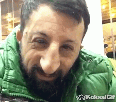 Koksal, a man with a beard and green jacket, makes affectionate expressions with the caption 'I sacrifice myself for you'.