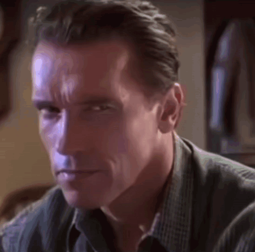 Arnold Schwarzenegger gives an intense side eye with a thoughtful expression in a dimly lit scene.
