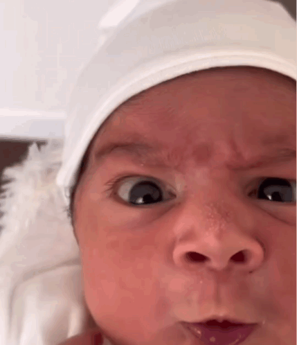 A newborn baby wearing a white hat makes a funny, scrunched-up face with wide eyes and pursed lips.