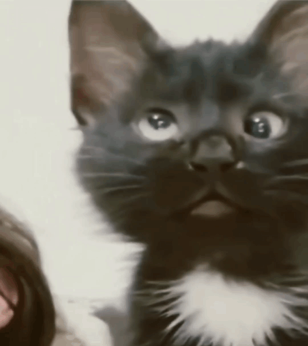 A black and white cat with wide eyes and an open mouth, displaying a surprised or shocked expression.