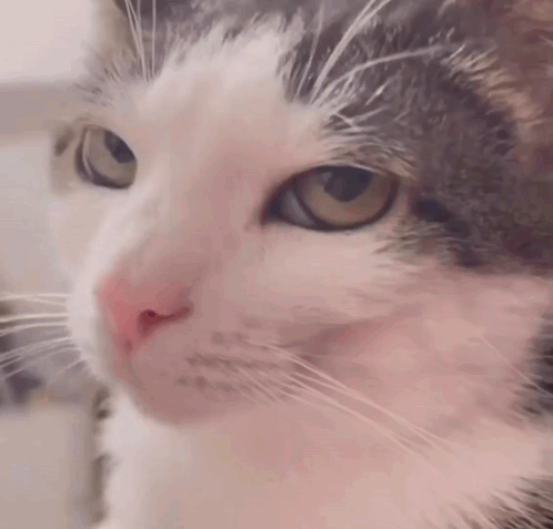 A close-up of a white and grey cat with green eyes, blinking slowly and looking sleepy.