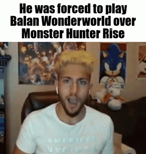 Fadel reacts with shock and dismay at being forced to play Balan Wonderworld instead of Monster Hunter Rise.