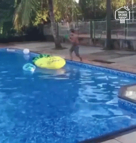 A person attempts a jump into a pool with an inflatable, resulting in a funny fail but still scoring a point.