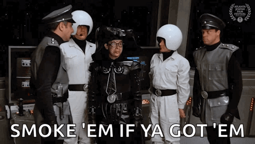 Dark Helmet faints in Spaceballs, surrounded by Colonel Sandurz and other officers, captioned 'Smoke 'em if ya got 'em'.