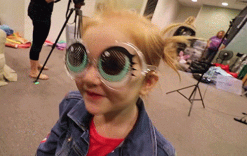 Adley smiles brightly while wearing oversized, funny fake eye sunglasses, bringing joy and laughter.
