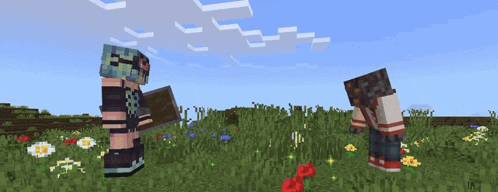 two minecraft characters are standing in a field with flowers