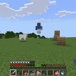 a screenshot of a minecraft game with a sheep and a man jumping in the air