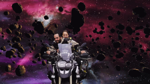 A couple embarks on an epic space journey on their Falkor Falcore motorcycle, navigating through an asteroid field.