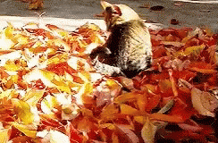 A playful tabby cat revels in a vibrant pile of autumn leaves, enjoying the spirit of fall break.