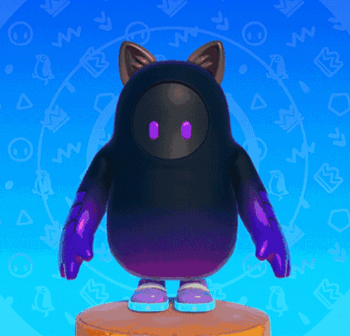 A black and purple Fall Guys character with cat ears and glowing shoes performs an acrobatic emote.