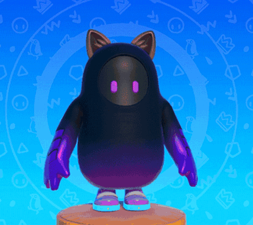 A Fall Guys character with black and purple skin, cat ears, and glowing shoes performs an emote.