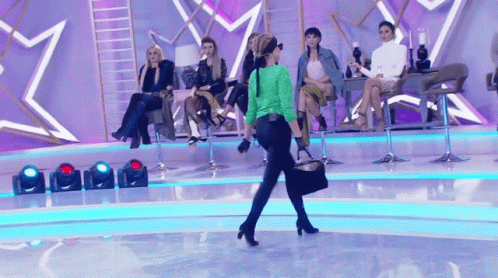 Bahar Candan slips and falls on stage during a fashion competition, wearing a green jacket and heels.