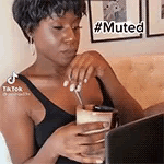 Woman's hilarious reactions to being muted and unmuted during a video call, stirring her drink.