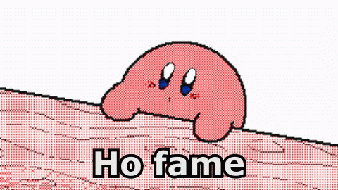 Kirby, the pink character, expresses hunger with 'Ho fame' and then happily eats a tomato.