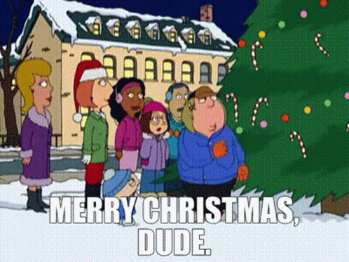 Chris Griffin and the Family Guy cast celebrate Christmas, with Chris wishing everyone a "Merry Christmas, Dude."