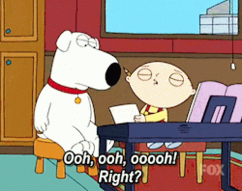 Stewie Griffin and Brian Griffin from Family Guy share a musical moment, with Stewie exclaiming 'Ooh, ooh, ooooh! Right?'