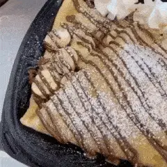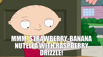 Stewie Griffin from Family Guy happily presents a delicious strawberry-banana Nutella with raspberry drizzle.