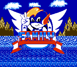 Family Kid Famicom character with wings makes peace sign, 'FAMILY' text, classic 8-bit game intro screen.