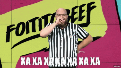 Fanis Lambropoulos, dressed as a referee, laughs hysterically in front of a 'Foititobeef' sign.