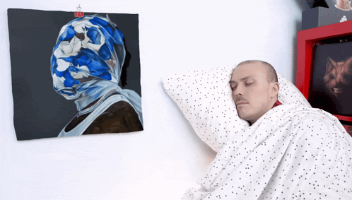 Anthony Fantano sleeping soundly in bed next to a painting of a person with a blue headscarf.