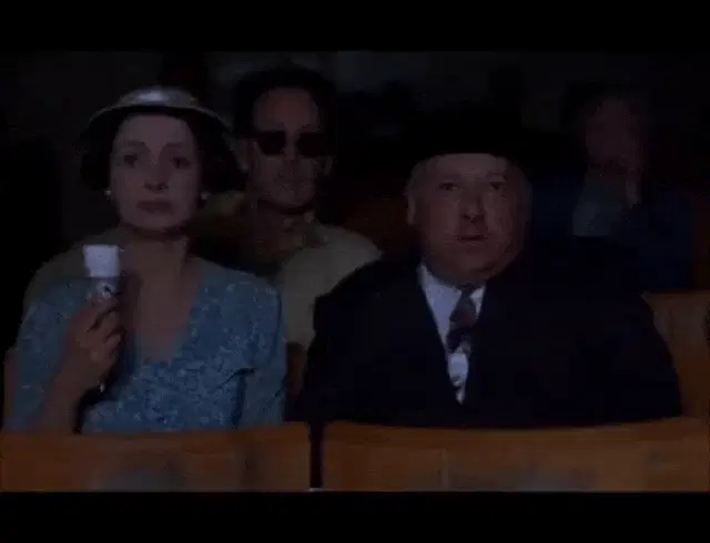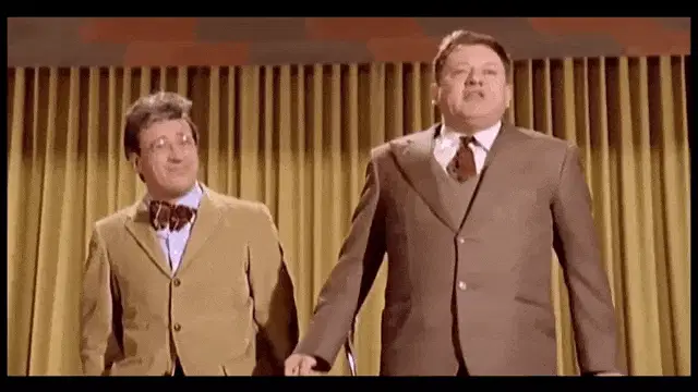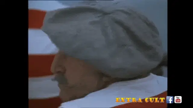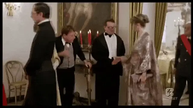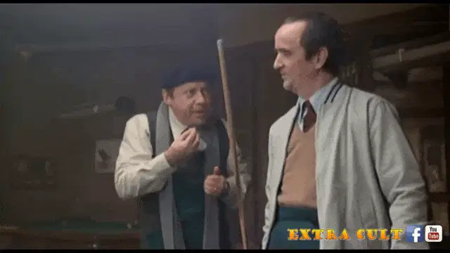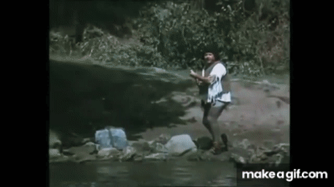 Fantozzi struggles with his umbrella in a rocky river, reminiscent of Excalibur.
