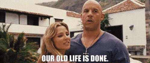 Vin Diesel as Dom Toretto with a woman, delivering the iconic line 'Our old life is done' from Fast & Furious.