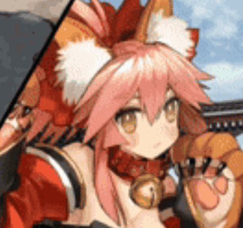 Tamamo, the pink-haired fox girl from Fate Samurai Remnant, shows a surprised and shocked expression.