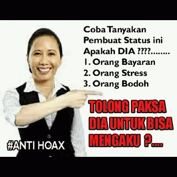 Woman points to text questioning the creator of a status, referencing 'Fatwa Prabowo' and an anti-hoax message.