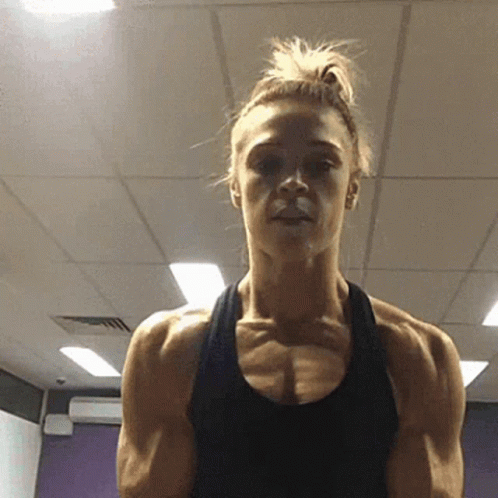Female bodybuilder performing bicep curls with a barbell in a gym.